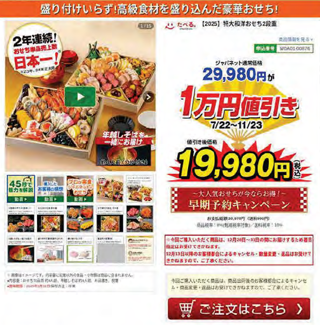 おせち早期割引で景表法違反:ジャパネットたかた vs. 消費者庁が対立した「販売計画の確実性」 (消費者庁:2025年9月12日)