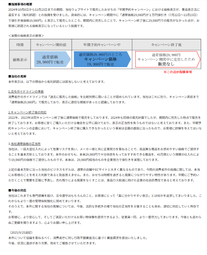 2025年9月12日、(株)ジャパネットたかたに対し、おせちの早期割引キャンペーン表示について景品表示法(有利誤認)に基づく措置命令が出されました。