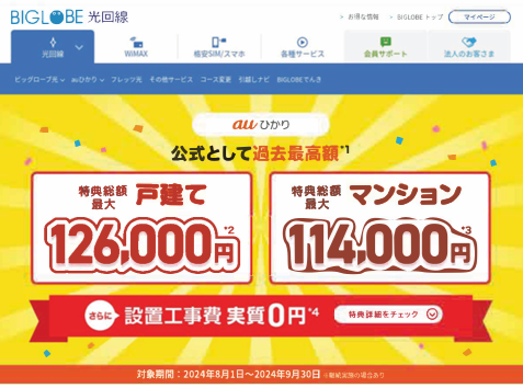 例えば、「公式として過去最高額」、「特典総額最大 戸建て126,000円」、「特典総額最大 マンション114,000円」、「さらに設置工事費 実質0円」、「対象期間:2024年8月1日~2024年9月30日 ※継続実施の場合あり」等と表示。