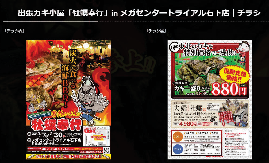 例えば、2025年2月22日から5月13日までの間、本件ウェブサイトの「出張カキ小屋『牡蠣奉行』inメガセンタートライアル石下店2025年3月7日~30日開催」と称するページに掲載したチラシにおいて、